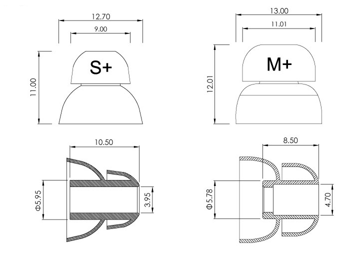 遮音性を重視しダブルフランジ形状を採用。S+とM+でフランジ形状を若干変更し最適化。遮音性を確保し低域の減衰を最小化。